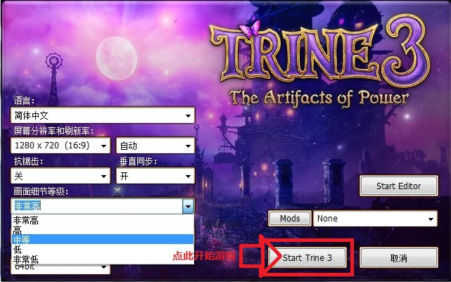 点击“Language”下拉里面的“简体中文”之后再点击右下角的“Start Trine 3”即可中文开始游戏