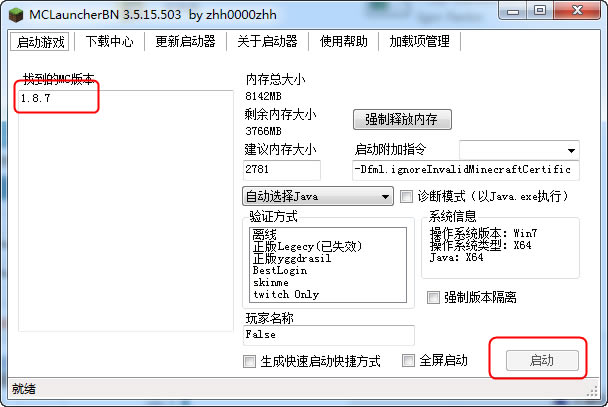 本游戏以《我的世界1.8.7》正式版纯净绿色包整合MCLauncherBN单独启动器,启动器版本为V3.5.15.503,本启动器功能相对完全,美观度较高。