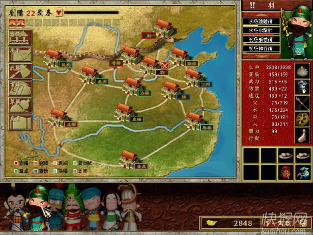 以往玩家只能培养蜀国阵营的人物,这次有了更多新的选择,例如玩家可以选择用曹操阵营进行游戏,体验一下官渡之战以寡击众的惊险,设五关六将擒拿关羽的快感,以及扭转赤壁之战狼狈奔逃的挑战;而以孙权阵营进行游戏也有英雄救美、上山采药、浮海探险、寻找玉玺………等等精彩桥段;当然刘备阵营这次也以全新的故事等着玩家来体验。由于三大阵营各有所长﹙蜀国擅长火攻,武将较多;吴国擅长水攻,智将较多;魏国擅长陷阱,将领素质平均﹚,因此不同的阵营,在玩法上会有很大的差异喔!h9N本站