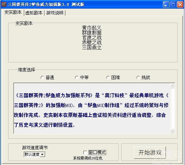三国群英传2鲈鱼威力加强版3.0是经典单机游戏三国群英传2的加强版MOD,经过系统的策划与修改,在保持游戏平衡的前提下,修正原版bug,增强电脑AI,提高画面效果,增加游戏新元素,增强可玩性,尽量还原武将在历史上与演义中的人物特性,同时,在策划过程中也大量收集了各论坛贴吧网友对群2修改的建议。游戏内置10个剧本,史实剧本5个,分别为:黄巾起义、群雄割据、官渡之战、赤壁之战、三国鼎立;虚拟剧本5个,分别为:江山美女、五鬼天下、三英反晋、汉晋风云、英雄集结。史实剧本无boss,虚拟剧本部分剧本有boss。游戏设置4个难度选择,设计理念上:“普通”偏重于原版模式,“中等”、“困难”与“挑战”偏重于新模式。(详见备注)精选原版中未出现的《三国志》与《三国演义》经典三国武将114人,游戏总武将数达514人。考究大量历史或演义资料,统计各武将武智因素与人物特性,对武智进行重新排序,在武力定位上重视战例,在智力定位上重视对战争的作用(实际上本版中“智力”叫“智谋”或者“谋略”更准确),文人墨客、术士隐人指数有所下调。在此过程中也参考了三国武评界布姜、韩宠、煮酒正熟等高手专业武评,在此表示感谢。根据武将的人物特点与事迹,为武将寻找合身的武将技、军师技、节操度、兵种、使用兵器、专属物品等。武将的技能的数量,初始体技按照原版规则执行。考虑原版出现高武低智武将(如典韦、吕布、文丑)缺技力的遗憾,特对武力94以上武将初始技力全部加成8点。(另外高级武器、高级官职有加成技力的功能,也可以一定程度上解决这个问题)群2是强调英雄主义的,太过了则难度下降,其一在于技能杀兵太强(兵太少),所以本版对所有武将技的杀伤力与消耗值进行平衡,相当部分技能对武将杀伤力提升,地泉系、飞矢系、伏焰系、雷光系等弱技能的消耗值降低,高级技能技力的消耗值则全面提高。新增不少特色技能,但最强技能仍是神哭鬼嚎,本版四鬼分配是:吕布、关羽、孙策、张辽(蜕变)。【注:吕布横扫三国,鬼哭非他莫属,关羽威震华夏,孙策威霸江东,张辽在投靠曹操后才名声威震,所以张辽跟随吕布的时候没鬼。赵云另设一特殊技能,威力也很强大” 】 XYt本站