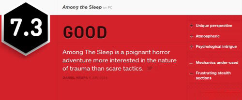 《睡梦之中》更想展现的是儿童时代的创伤,而不是给玩家提供一些恐怖的瞬间,这并不是一件坏事。游戏的故事有些稀松,结尾的冲击也没有完全的体现出来,但是游戏扭曲玩家的视角,把日常生活的地点变为噩梦般的体验,让游戏还是值得一玩的。游戏中的游戏机制没有全面发挥出来,但是游戏心理恐惧的特色和刻薄的结尾都让他比其他一些单纯依靠惊吓的游戏出色很多。