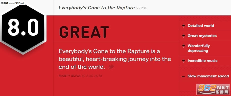 5小时的游戏体验,《万众狂欢》可以说是我见过细节最逼真,最接近真实世界的游戏之一,游戏构筑了一个具有带入感的世界,拥有个性丰富的角色,同时给予玩家奇妙的游戏体验。但似乎开发商为了让我们不错过游戏任何一个细节特地减缓了游戏的节奏,放慢了我们的脚步,这一点确实有些浪费时间。IGN给出8.0分。