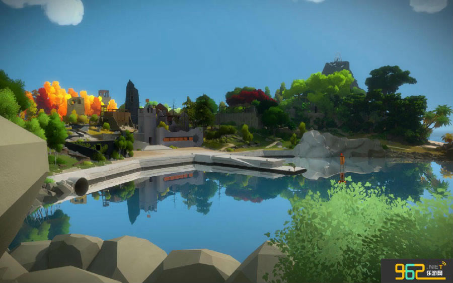 从进入游戏后就能感受到本作清新柔和的画风,精致的画面毋庸置疑的是本作一个好评的地方,《见证者》尽可能的为玩家展示了一座风景如画的小岛景色。如镜面一般分割开来的山水。残破未知的古堡小镇,迷人的火红色枫叶林。玩家可以自由的在岛上探索,从自己想要感兴趣的地方下手解谜。