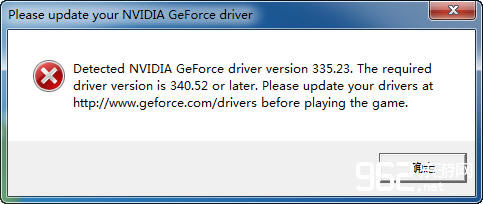 运行游戏时,如遇到如下对话框,请将显卡驱动更新至340.52版本或跟高。