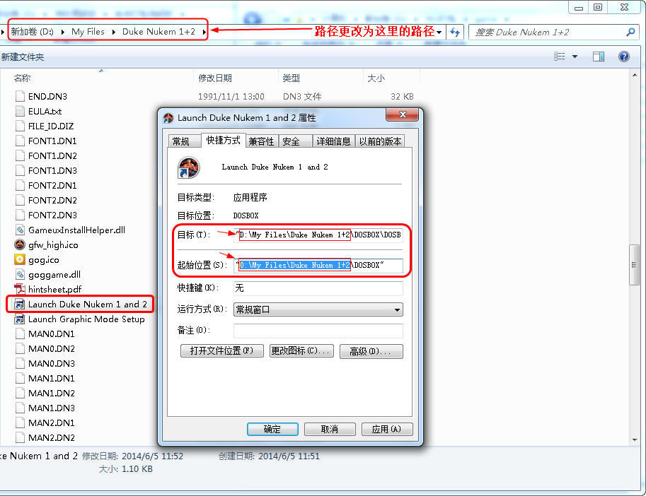找到游戏目录下的“Launch Duke Nukem 1 and 2”然后鼠标右键选择属性,将“目标”以及“起始位置”的路径更改为对应的目录路径即可。
