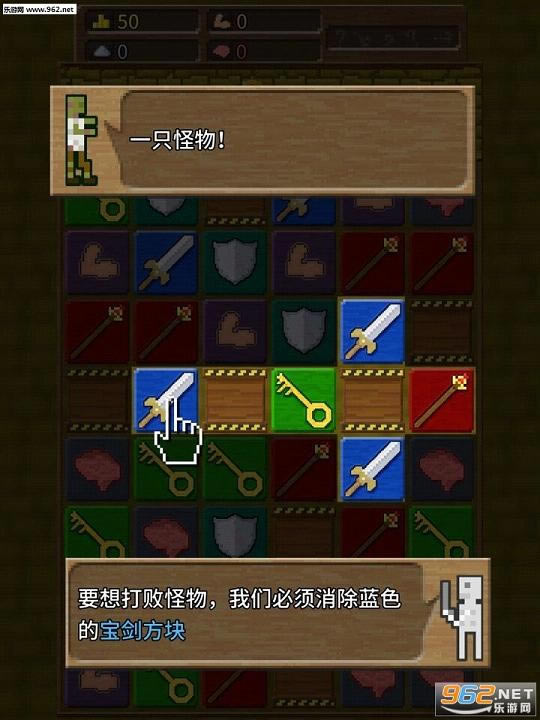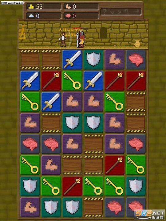 每三个种类相同的方块便可以进行消除,游戏中的方块种类同分为:宝剑、盾牌、法杖、钥匙、肌肉等多种,其中宝剑和法杖可以用来攻击你面前的怪物,钥匙可以开启面前的宝箱,而肌肉则能增强你的攻击力。而在这个无尽模式的跑酷中,除了你被怪物攻击到HP为零后可以结束任务外,它的屏幕还会不断的向前推进,只要你的小人被屏幕追上也是会立刻GAME OVER的,这也就让本来很休闲的三消充满了紧张感,对于玩家们的反应速度和观察力有着很高的要求。