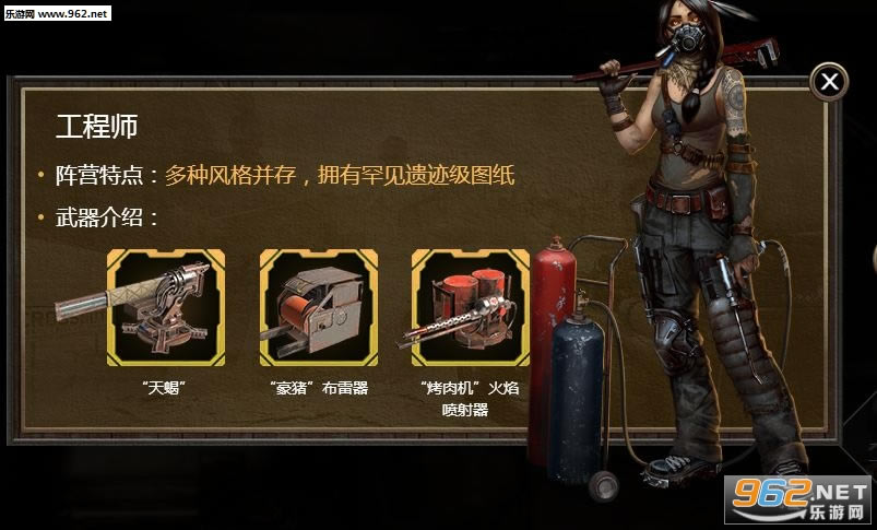 —工程师阵营为基础阵营,武器及部件风格比较中庸,主要为机枪及重炮等;狂人阵营风格较为狂野,车体多为轻型结构,武器多为霰弹枪及自爆长矛、链锯等近战武器;游民则偏向于机枪系精准武器;拾荒者更多的是重型装甲和重炮,风格类似装甲车及坦克。
