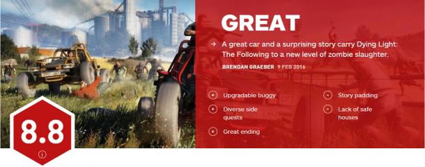 把跑酷抛在脑后,反而开起车来,似乎在《消逝的光芒:信徒》当中不太合常理,但是配合着这个大型DLC里面的多个任务,驱车前行看起来又是一件合情合理的事情。IGN最终给《消逝的光芒:信徒》分数为8.8分。