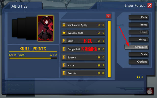 游戏一开始默认玩家是无法使用闪避的,没击退一波怪物之后将会有1分钟的时间给玩家调整装备技能等,按下ESC后,选择Techniques选项来学习二段跳以及翻滚闪避等,对你在战斗中非常有利。