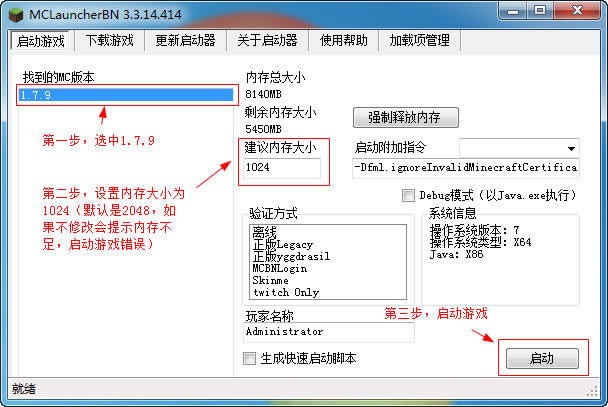 这次我的世界1.7.9启动器采用的是MCLauncherBN版的,玩家进游戏前需要进行简单的设置,具体操作方法如下: