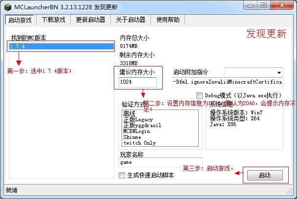 这次我的世界1.7.4启动器采用的是MCLauncherBN版的,玩家进游戏前需要进行简单的设置,具体操作方法如下: